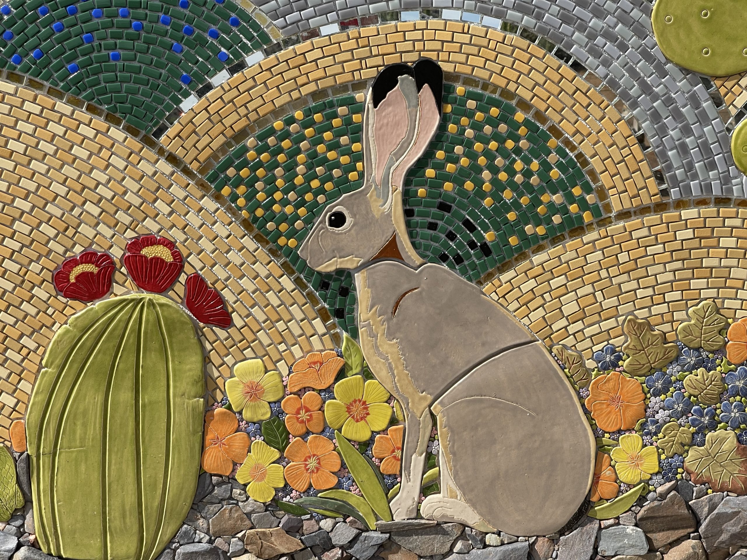 The plaza at the Ranch Trailhead, lovingly named Suzan’s Place in memory of Suzan Harrington, is the perfect spot for gathering before or after a hike, or to just sit and view the 100 foot art piece. The Mosaic is a dawn-to-dusk tableau encompassing beautiful plants and fascinating creatures shown in their native habitats. Virtually every bird, butterfly and insect found in the Sonoran Desert is represented.